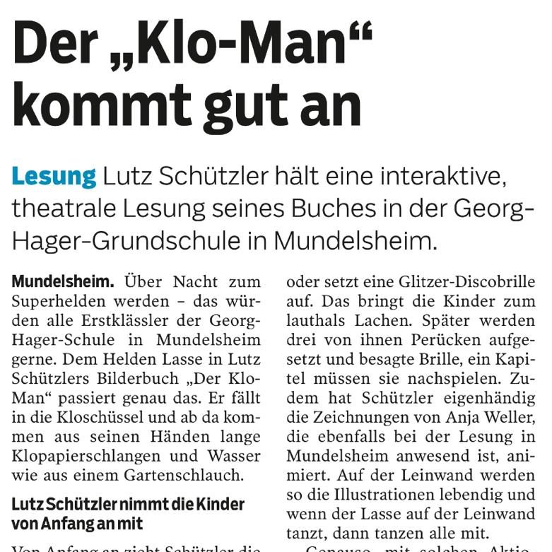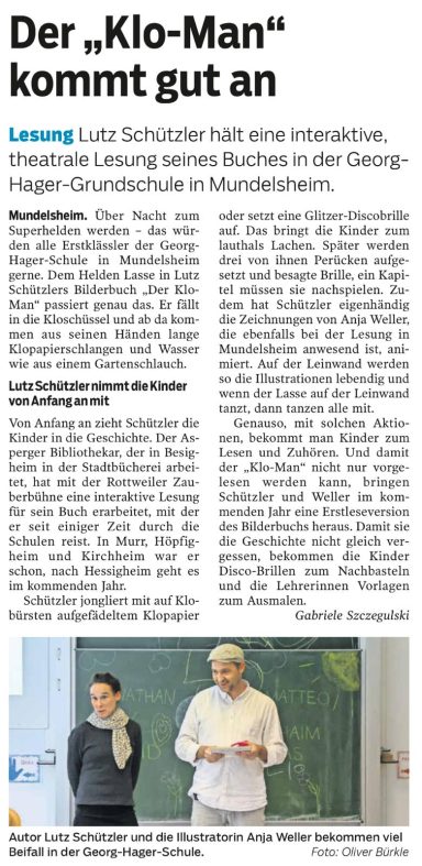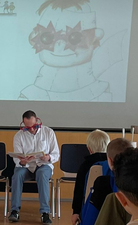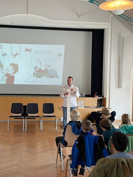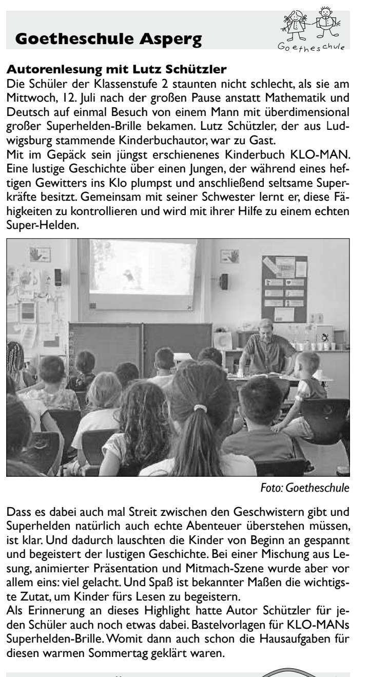 „Bei einer Mischung aus Lesung, animierter Präsentation und Mitmach-Szene wurde aber vor allem eines: Viel gelacht. Und Spaß ist bekanntermaßen die wichtigste Zutat, um Kinder fürs Lesen zu begeistern“ (Goetheschule, Asperg)