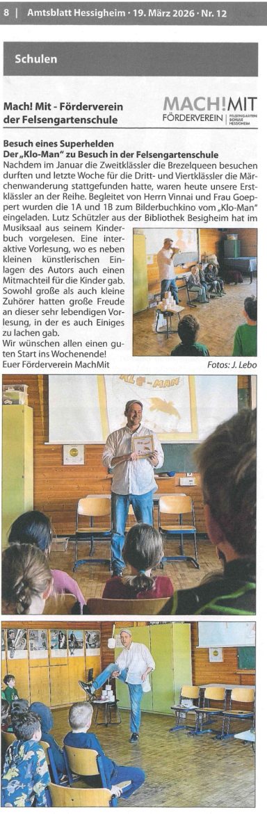 "Eine interaktive Vorlesung, wo es neben kleinen künstlerischen Einlagen auch einen Mitmachteil für die Kinder gab ... große und kleine Zuhörer hatten große Freude an dieser sehr lebendigen Lesung, in der es auch Einiges zu lachen gab. (Felsengartenschule Hessigheim)